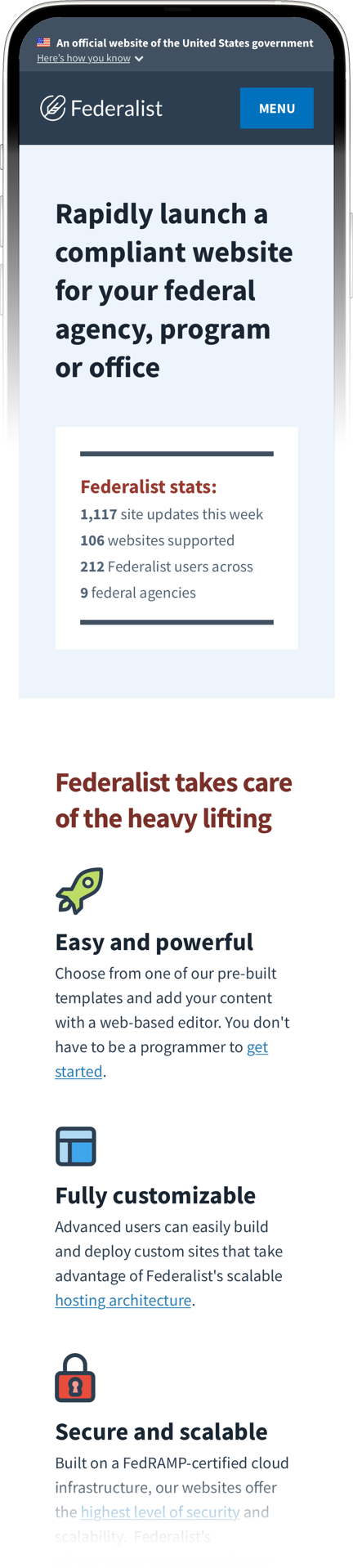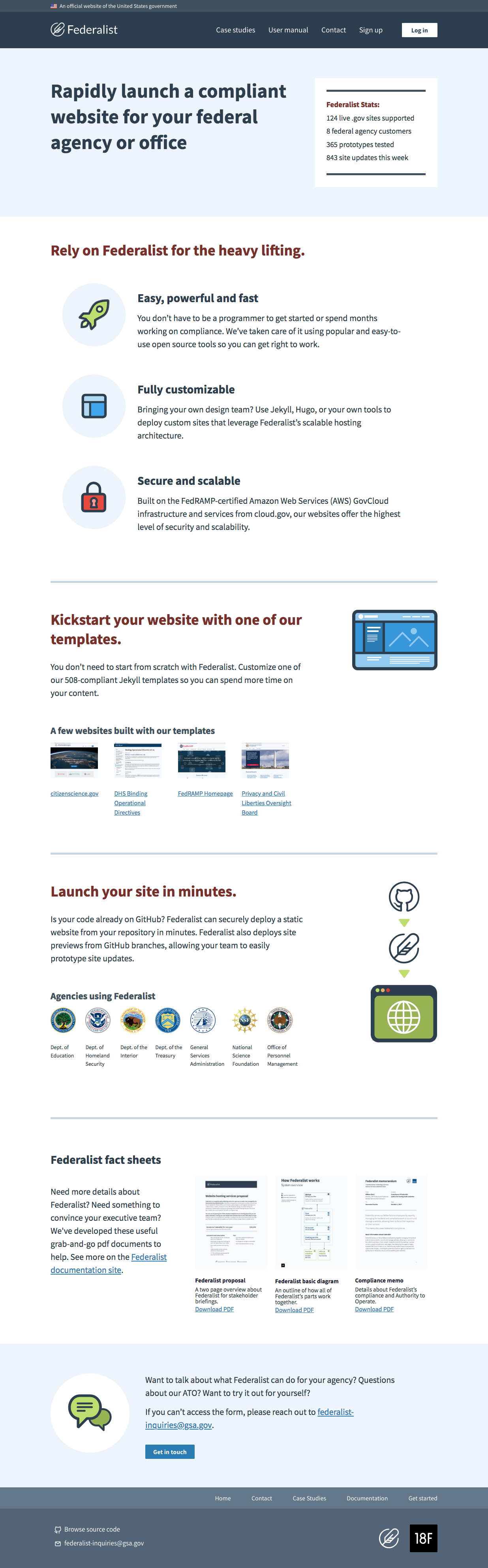 Federalist (now Pages) offers government agencies an easier way to launch compliant websites. My overhaul of the public-facing website gave potential customers a friendly introduction to this product, progressively revealing it in digestible fashion. In addition to visual design, I provided wireframes, information design, content design, and more for this project.